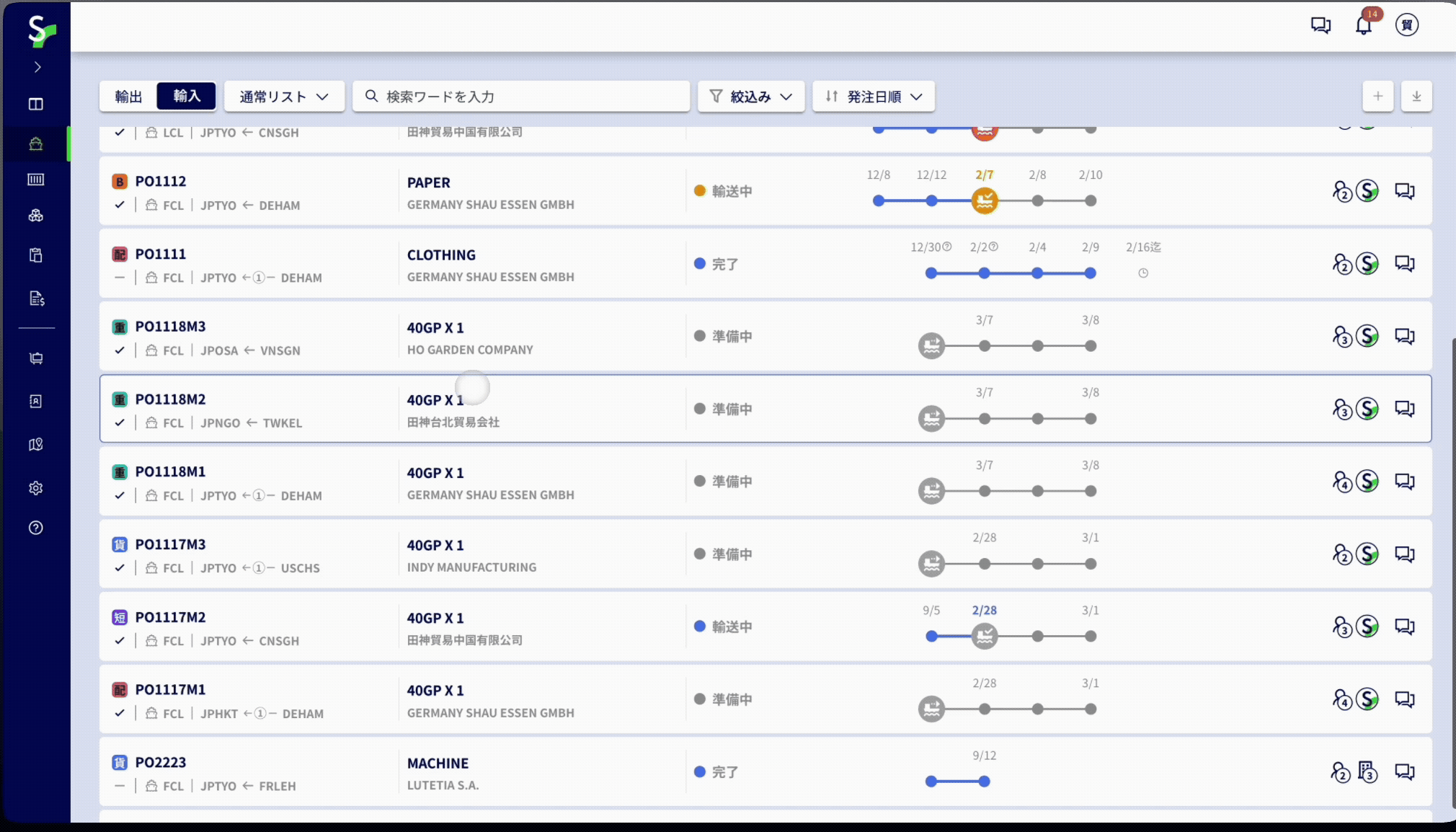 Shippioがフォワーディング事業の中で培った独自のロジックにより、正しい日付(ETD, ETA)や本船のステータスを算出する仕組みとなっています。各データソースからのデータ取得はシステムと人力のハイブリッドになっておりますので、船社から自動で日付・本船ステータスを取得できない場合でも、Shippioクラウドサービスは自動トラッキングを行うことが可能です。