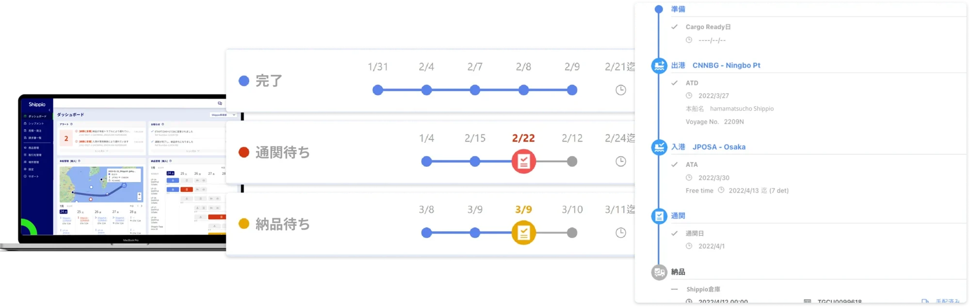 Shippioがデジタルフォワーディングで培った独自のロジック×オペレーションにより、正しい日付(ETD, ETA)や本船のステータスを算出しています。本船ステータスが自動で取得できない船社もトラッキング対象となっています。