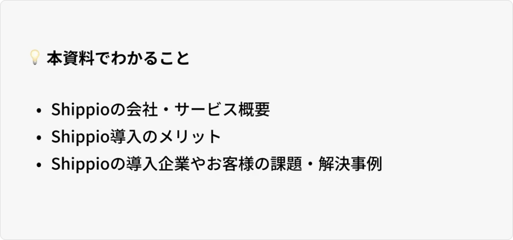 初めてShippioを知って頂く方向けに、サービスの概要や事例をわかりやすくご紹介する資料をダウンロードできます。