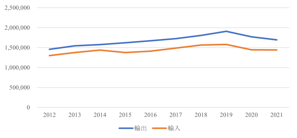 はじめに、輸送量の動向から述べていきましょう。2021年における日本とのコンテナ輸送量が多い相手国を示した表1の通り、韓国との間で輸出入を行うコンテナの輸送量は中国に次いで世界第二位となっています。輸出が169.3万TEU、輸入が144.0万TEUであり、輸出が輸入を上回っています。輸出と輸入を比べると、2012年からコロナ前の2019年まで輸出量と輸入量の差は拡大傾向でした。2019年には両者の差は33.3万TEUまで増加しました。しかし、2020年以降は若干差が縮んでいます。