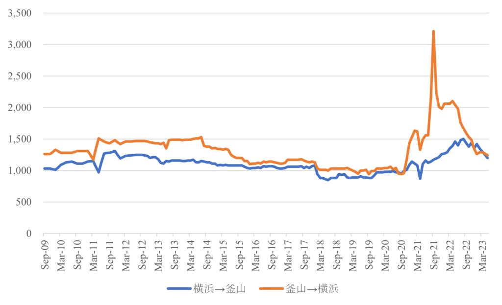 2020年後半以降、コロナ禍に伴うコンテナ不足やサプライチェーンの混乱に伴って、日韓航路でも運賃が急上昇しました。釜山から横浜への運賃が特に大きく上がっており、日本向けの輸送が大きく混乱していたことを反映しています。