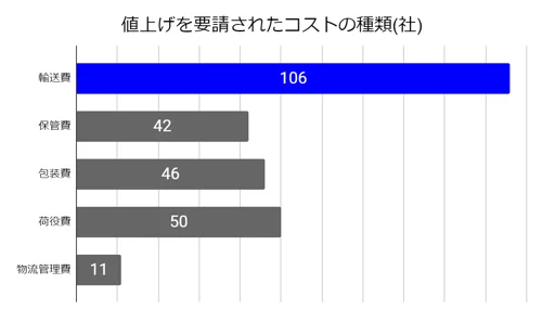 2022 年度 物流コスト調査報告書の「値上げを要請されたコストの種類」のアンケートによると最も値上げ要請がされたのは輸送費の106社となっています。