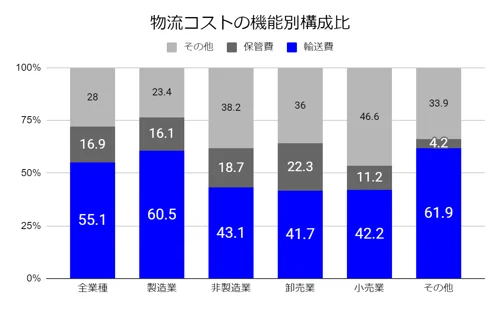 以下の図は業種別にみた物流コストの機能別構成比を表したものです。