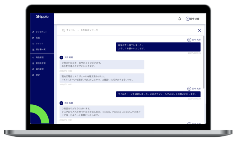 これまで電話やメール、FAXを駆使していたコミュニケーションを、チャットに集約できます。納品先など外部物流事業者との納期調整もこのチャットで簡単にできます。