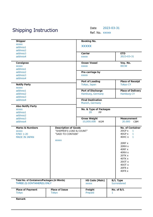 - 通関業者が船積み手続きを行う際の指示書として使用される。