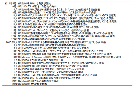 2008年の協約改定は順調に進んだため、物流が混乱する事態には至りませんでした。一方、2014年5月に始まった労使協約の改定交渉では健康保険給付金について暫定合意が得られたのちは、ILWUとPMAの対立が埋まりませんでした。同年11月以降、両者の対立は激化し、ILWUによる組織的スローダウンや熟練労働者の配置拒否が行われました。2015年に入るとPMAも本船荷役の中止など、対抗措置をとり始め、同年2月にはロックアウトの可能性も懸念されるようになったのです。しかし同月、連邦政府から派遣されたペレス労働長官の仲介で暫定合意に達し、同年5月にILWUの組合員投票を経て新しい労使協約が正式発効しました(表1参照)。