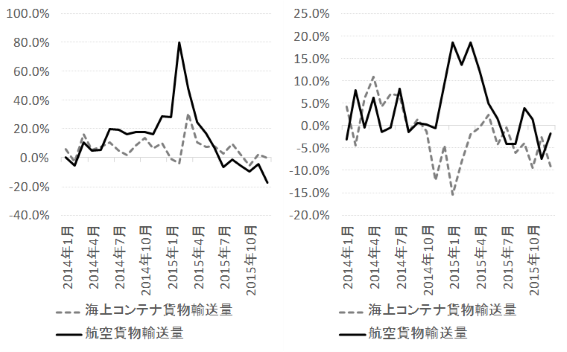 単月ベースでみると米国向けでは、2015年1月や2月のように海上コンテナ輸送量が前年同月比でマイナスとなった月があり、航空貨物による海上コンテナ輸送の代替が行われたことを示唆しています(図1左側参照)。アジア向けでも海上コンテナ輸送が前年同期比で減少する一方で航空貨物輸送量では増加が続き、やはり航空輸送での代替が行われたと考えられます(図1右側参照)。