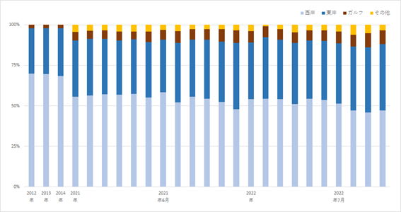 このような動きを受けて、アジア発米国向けコンテナ荷動きでは、西岸港揚げのシェアが低下しています(図2参照)。コロナ禍前まではLA/LBなどの西岸港で貨物を揚げる割合は約6割でした。しかし、2022年8月に初めて50%台を割り込み、10月まで3カ月連続で40%台で推移するようになりました。9月には、NYNJやサバンナなど東岸港、ヒューストンなどのガルフ港を合算したシェアが西岸を逆転しました。