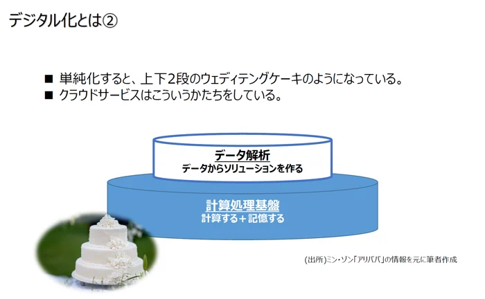 クラウドサービスは単純化すると上下二段のウェディングケーキのようになっており、下半分が計算処理基盤(計算+記憶)、上部はデータからソリューションを作るデータ解析基盤を成しています。Amazon Web Servicesを例に考えると、ストアは250-300のマイクロサービスで構成させています。