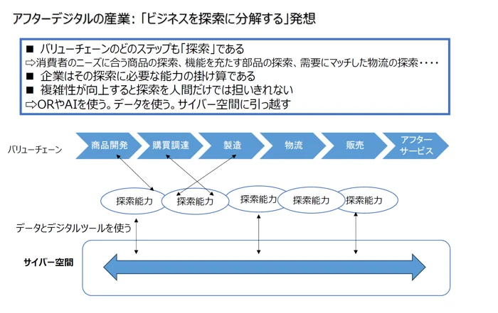 企業に求められるのは探索の能力であり、複雑性が向上すると探索を人間だけではとても担いきれないため、データとデジタルツールを使うことで、フィジカル空間の事象をサイバー空間へと引っ越すことが重要となります。