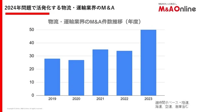 今、多くの業界で「人手不足」がM&Aのひとつのキーワードになっています。人を採用できる会社、人を育てられる会社は買い手に回り、逆にできていない会社は離脱して売り手に回るという構図です。2024年問題の影響もあってか物流業界は特に顕著です。同意なき買収は評判やイメージを悪くする可能性もあり、企業としては軋轢を生むので敬遠されるものですが、もはやなりふり構っていられなくなってきているようにみられます。