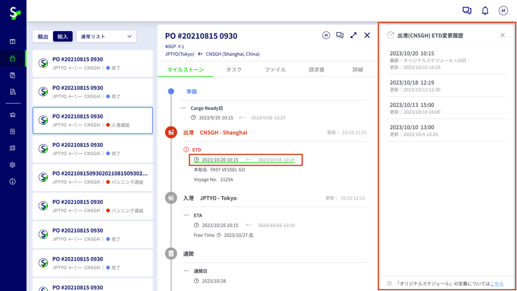 Shippioのクラウドサービスは、シップメントごとの進捗管理をマイルストーンで表示します。本船の遅延日数も、最新の日付(ETD、ETA)と、当初取得のオリジナルETAを比較して算出します。さらに、遅延の履歴も確認できます。