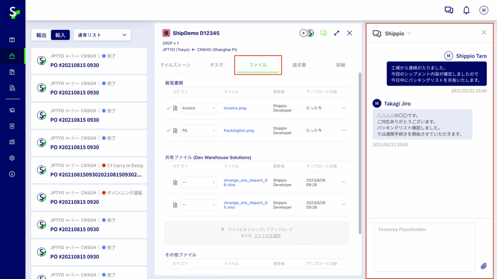 さらに、シップメントごとにチャット機能があるので、メールを開かずとも画面上のチャットでコミュニケーションが取れます。