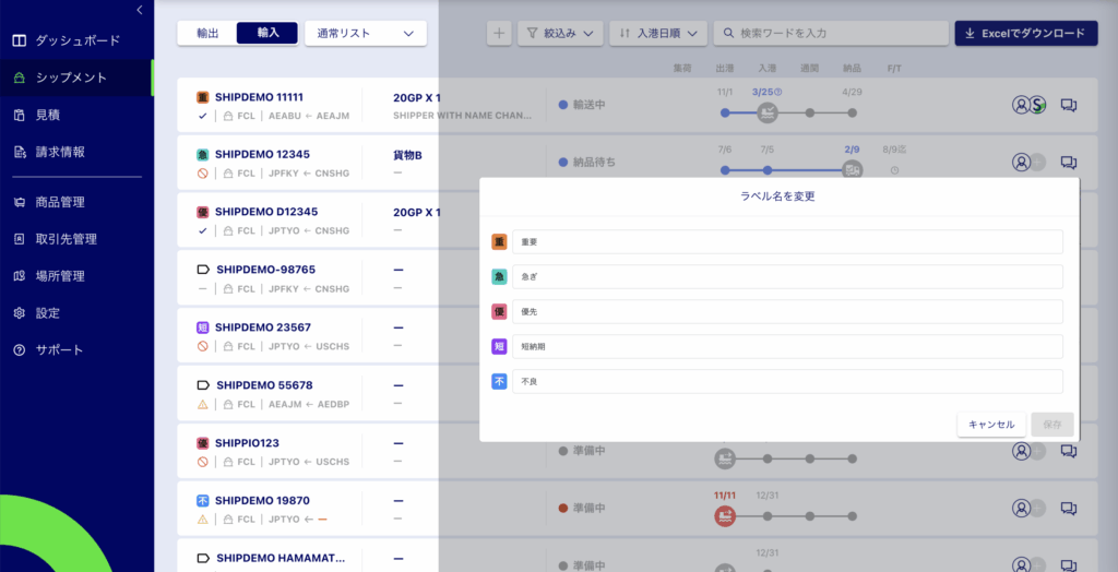 シップメントごとにラベルを貼ることで、視覚的に管理することが可能です。ラベルは5種類あり、好きなワードでカスタマイズできます。