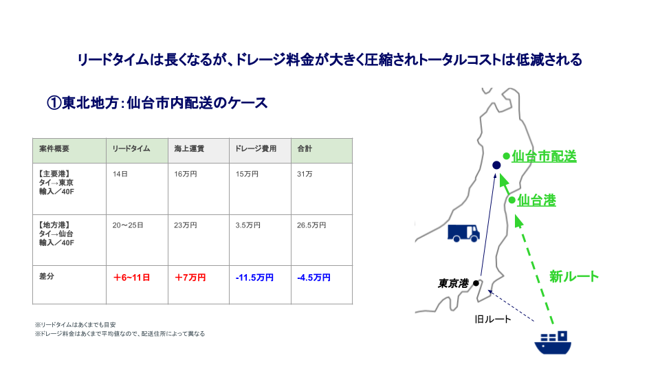 - 地方港: タイから仙台港揚げ → 仙台市内までの短距離ドレー