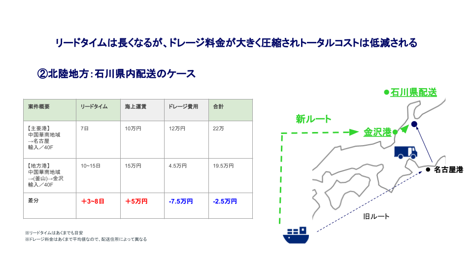 - 地方港: 中国華南地域から金沢港揚げ → 石川県内までの短距離ドレー