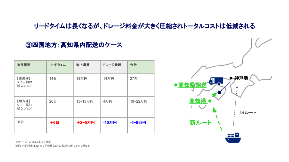 - 地方港: タイから高知港揚げ → 高知県内までの短距離ドレー