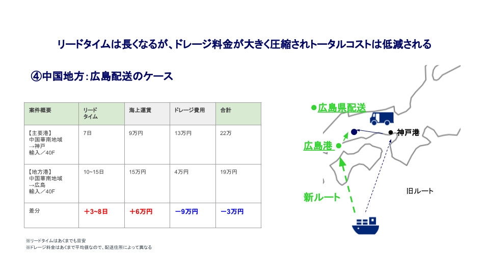 - 地方港: 中国華南地域から広島港揚げ → 広島県内までの短距離ドレー