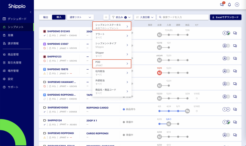 これで、一覧には博多港を利用しているシップメントのみが表示されます。さらに、特定のシッパーを利用している場合、シッパーの絞り込みも可能です。