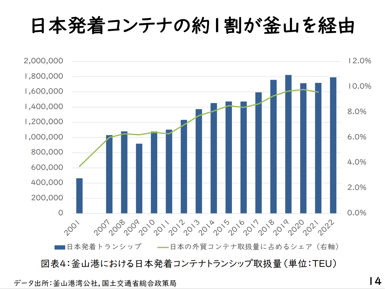 日本発着コンテナの約1割が釜山を経由しています。日本の地方港にとって、釜山港との航路は重要な国際航路であり、釜山港は外国との貿易に際して通過するチェックポイントです。