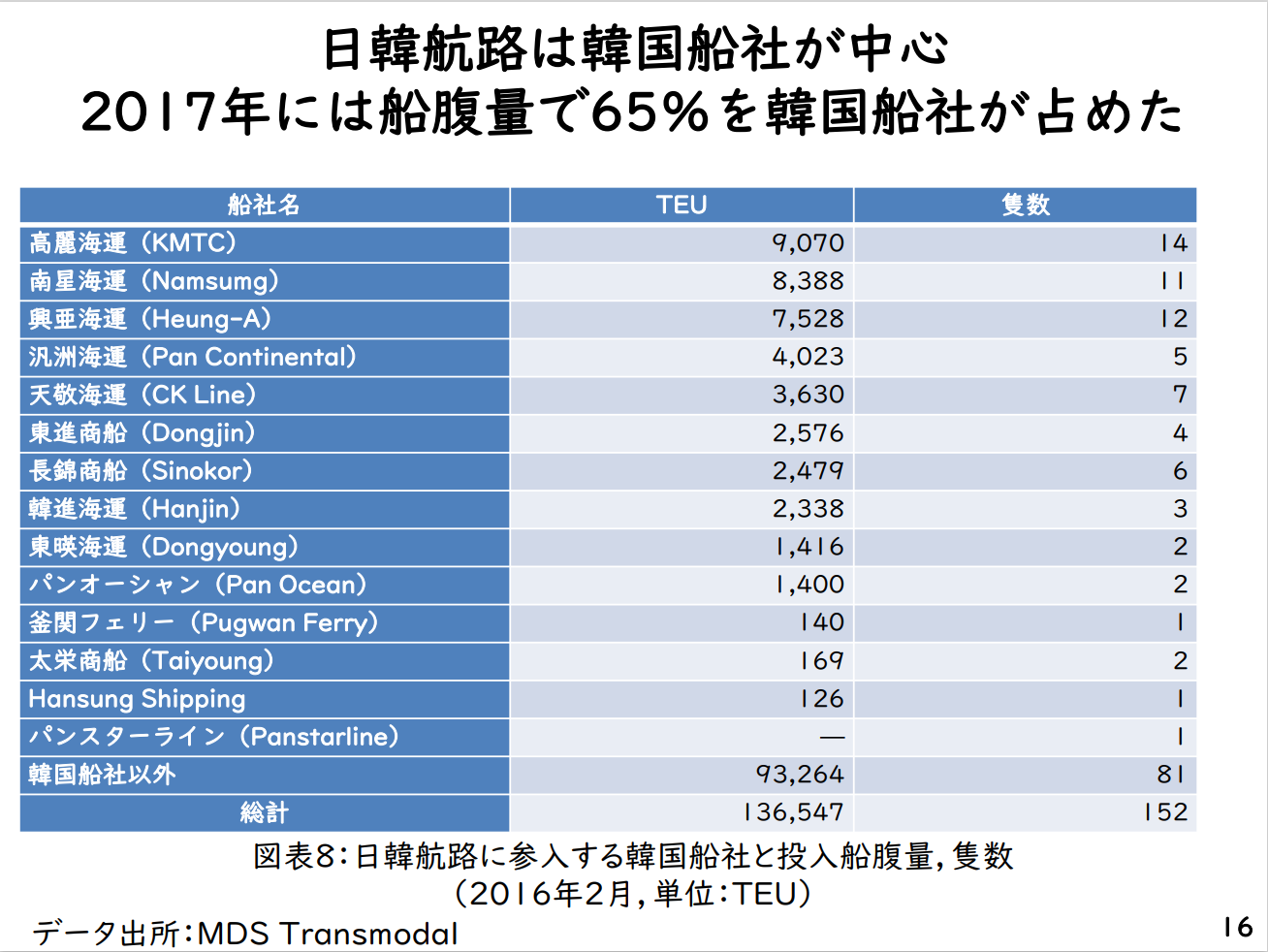 日韓航路は韓国の中小船社のシェアが圧倒的に高いことが特徴です。2017年には日韓航路の船腹量で65%を韓国船社が占めていました。