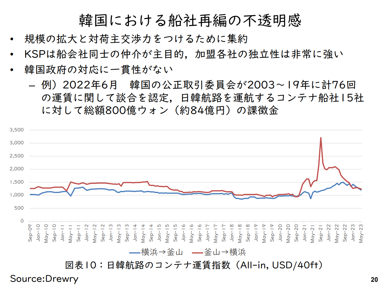 韓国船社には再編の動きがみられています。再編が進むと航路の合理化が行われて、寄港しない港が発生します。その影響は背後の荷主企業や地域経済全体にも及ぶことになります。
